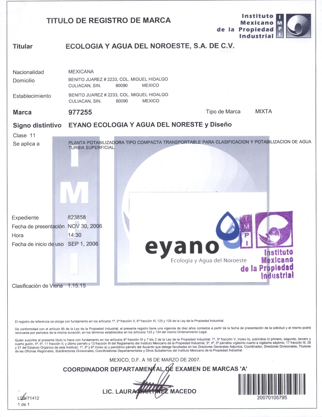 - Registro de marca "Potabilizadora Compacta Eyano"